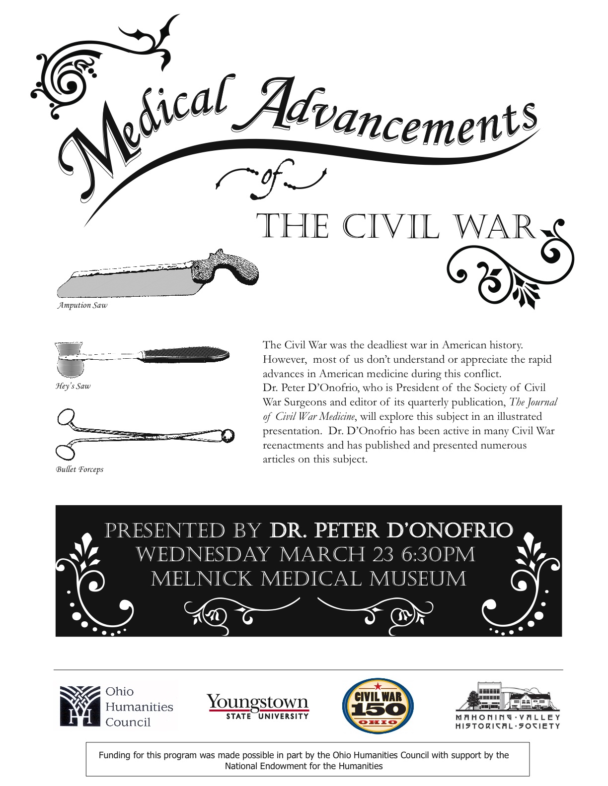 To recognize the beginning of the Civil War Sesquicentennial (2011- 2015), the Melnick Medical Museum, the Mahoning Valley Historical Society, and the History Department of Youngstown State University are hosting this FREE event which is open to the public. The presentation will be given by Dr. Peter D’Onofrio, who will be dressed in a Civil War surgeon’s uniform. He will speak on the rapid advancements in medicine stimulated by the Civil War and the impact of these advancements to later developments in American medicine.