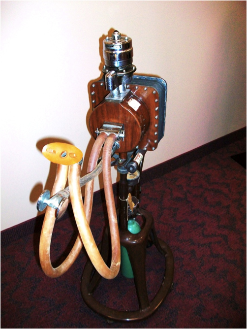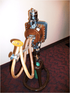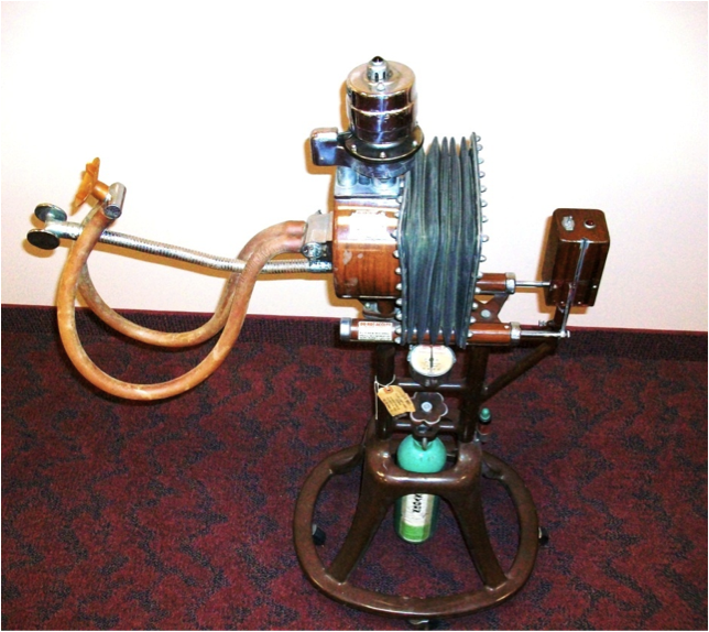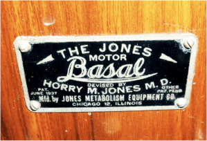 The Jones Motor Basal respirometer, manufactured in 1937, was created by the medical doctor, Horry M. Jones. The Jones Motor was a device used to look into a patient’s breathing patterns by using calculations for understanding breathing patterns, including respiratory rate, volume, rhythm and basal metabolism. Basal metabolic rate is the amount of energy used per day by a person at rest. It can be determined by measuring the amount of time it takes a person to consume a given quality of oxygen. The higher the metabolic rate, the faster the oxygen is consumed.