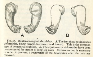 The treatment for clubbed feet in the 1950s depended on the severity of the deformity. For mild cases, gentle stretching by the mother or nurse would help stretch the shortened tendons, especially the heel cord. This would be continued multiple times a day for a period of months until the foot could be held in a normal position.
