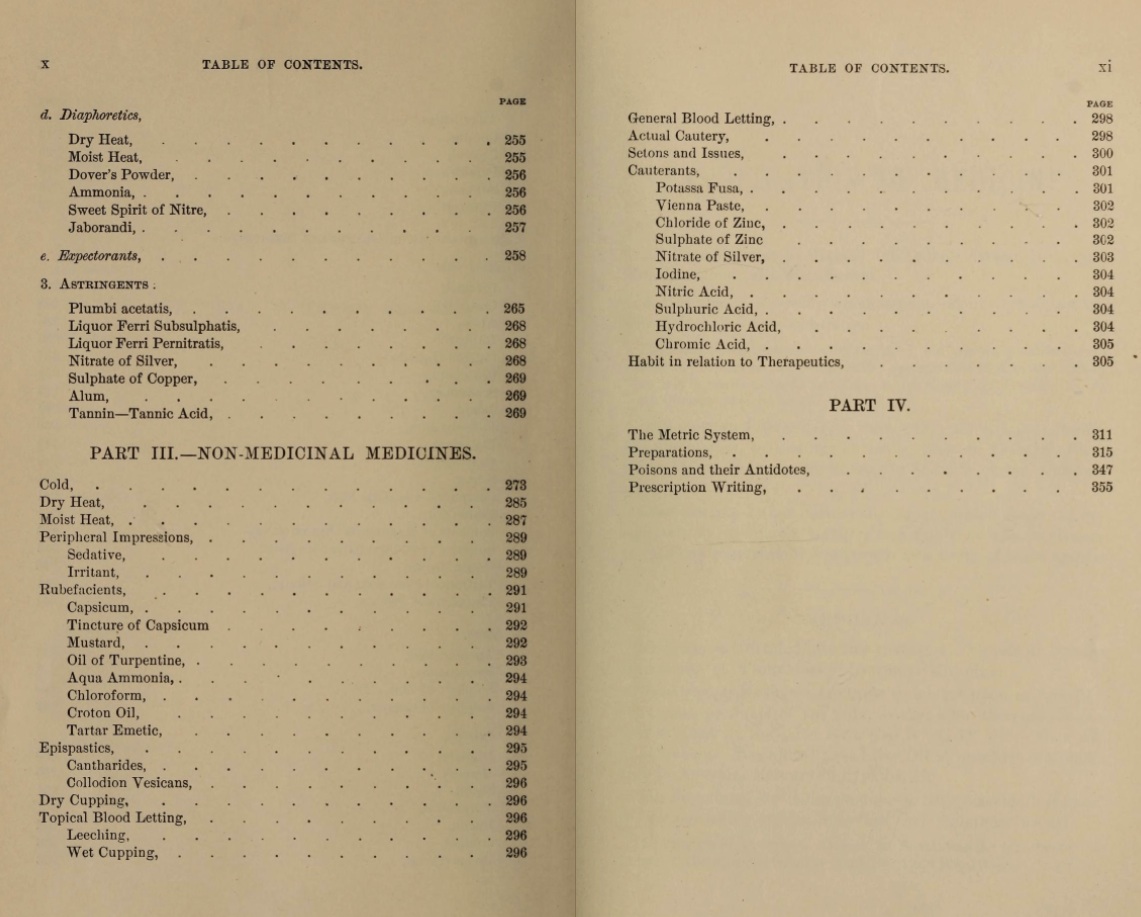 Physicians who were up-to-date with medical research might be familiar with the ideas similar to the ones taught by Dr. William H. Thomson. He was a medical professor at the University of the City of New York. He published a book “Notes on Materia Medica and Therapeutics,” which was adapted from his lectures given in the 1888-1889 school year. This book gives a useful overview of the methods for treatment in the late 1800s. In this book, he divides all treatments into three broad categories: medicines, non-medicines, and disinfectants. (Non-medicines included treatments such as massage, baths, blistering, applying heat or cold, caustics, and counter-irritants.)
